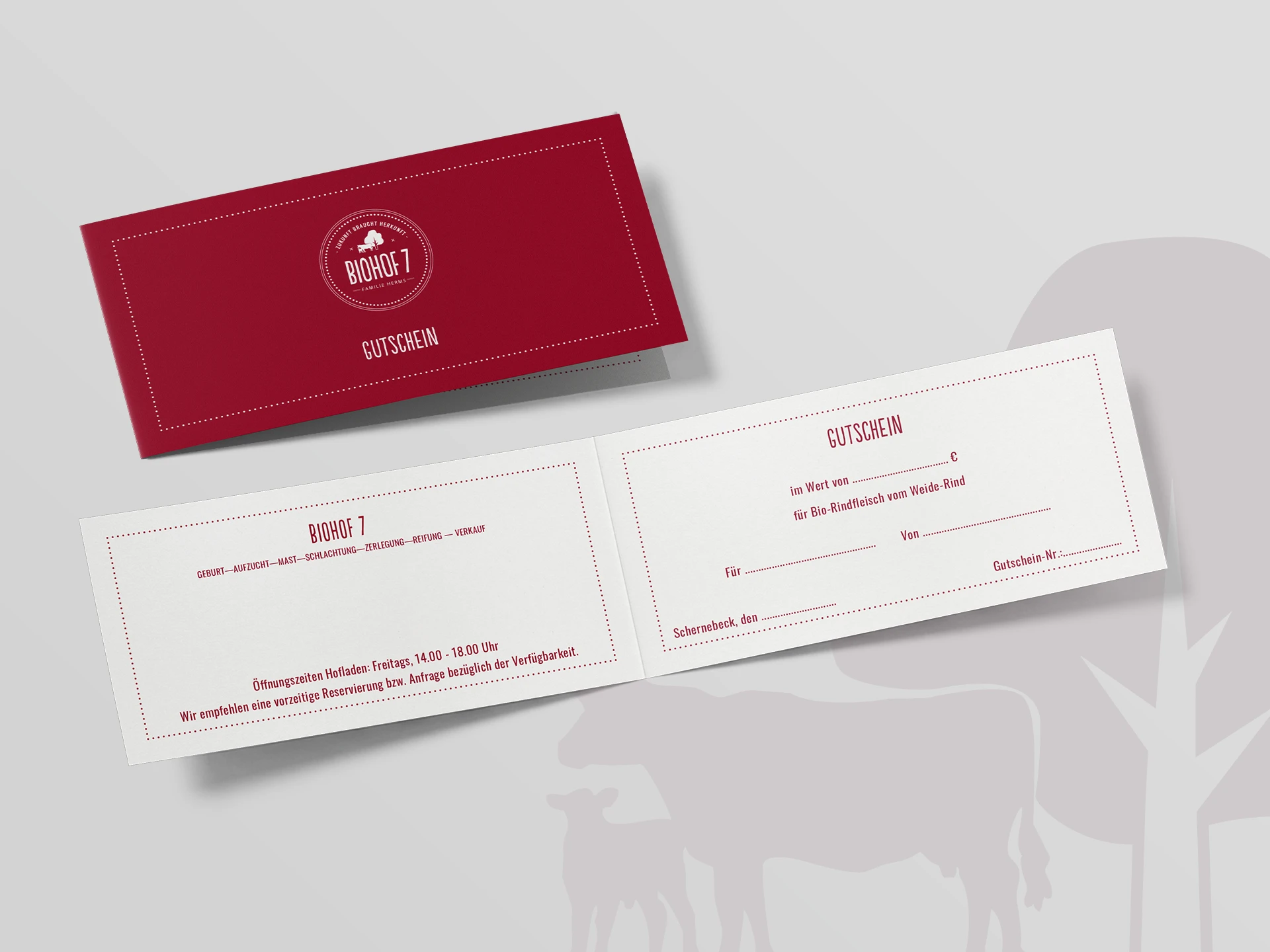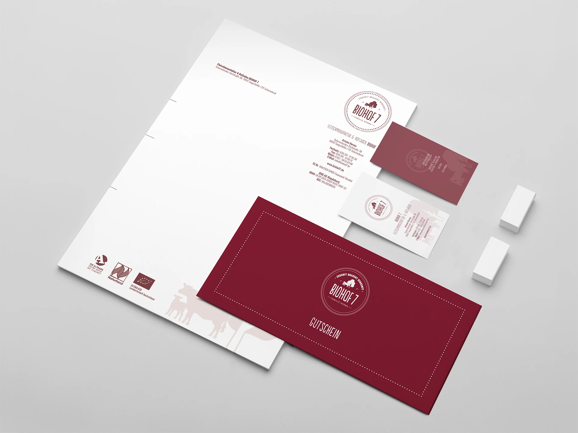 Gemeinsam visualisierten wir die Wort-Bild Marke und entwarfen Geschäftsausstattung und weitere Kommunikationsmittel des mit einem hohen Anspruch an Transparenz und Qualität arbeitenden Unternehmens. Der BIOHOF 7 steht für nachhaltige, artgerechte Rinderhaltung auf höchstem Niveau. Natürlich BIO. So werden alle Arbeitsschritte, von Geburt über Aufzucht, Mast, Schlachtung, Zerlegung und Vermarktung, in einer geschlossenen, regionalen Wertschöpfungskette auf ihrem schönen Hof in der Altmark durch die Familie begleitet.