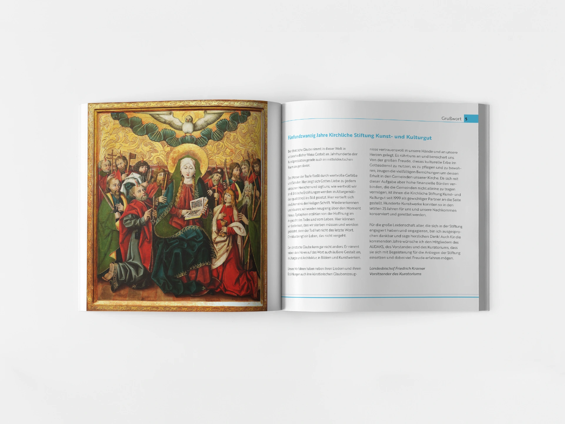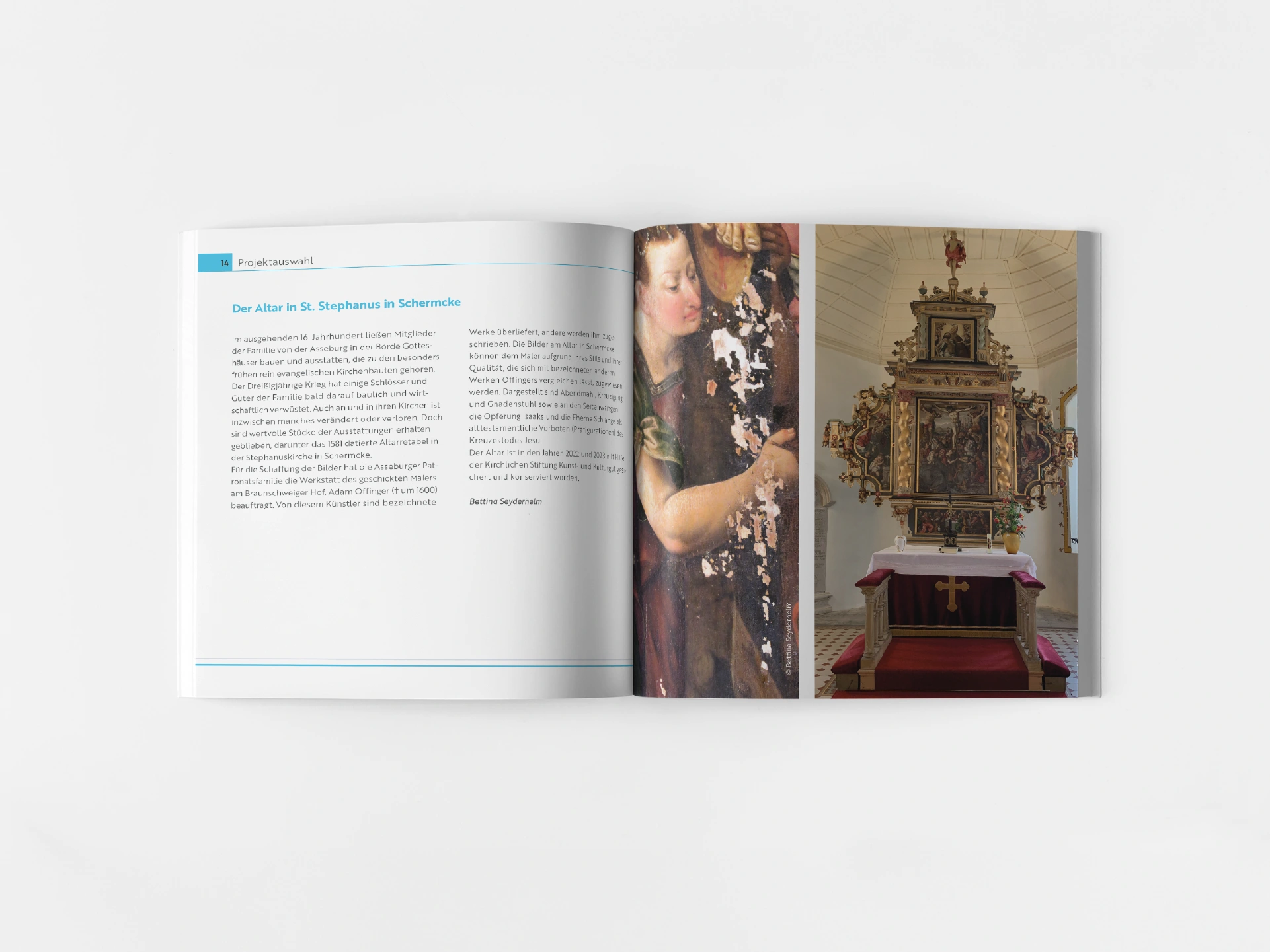In unserer Branche bekommt man es ja öfter mal mit ziemlichen Originalen zu tun. Bei diesem Projekt waren es gleich mehrere. Denn unser Auftraggeber, die Kirchliche Stiftung Kunst- und Kulturgut in der Kirchenprovinz Sachsen (KSKK), widmet sich dem Erhalt wertvoller Kunstschätze. Klar, dass die mühevoll restaurierten Originale in der neuen Jubiläumsbroschüre auch möglichst gut zur Geltung kommen sollen.