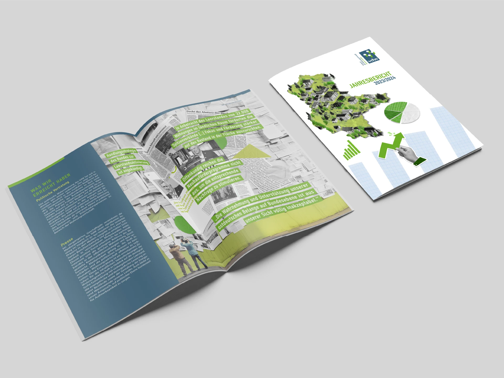 Die Aufgabe bestand darin, den Jahresbericht 2023/2024 für den VdW zu erstellen. Der Bericht sollte die Stabilität der Wohnungsgesellschaften trotz Herausforderungen wie Inflation, gestiegenen Baukosten und Zinsbelastungen dokumentieren. Ebenso sollte er das soziale Engagement der Mitgliedsunternehmen hervorheben und die Forderung nach stärkerer Unterstützung durch den Bund betonen. Erfolgreiche Bauprojekte wurden gewürdigt, und die Notwendigkeit einer Verbesserung der politischen Rahmenbedingungen angesprochen. Diese Themen sind von zentraler Bedeutung und sollten in einer ansprechenden, visuellen Form präsentiert werden, um die Botschaften effektiv zu vermitteln.
